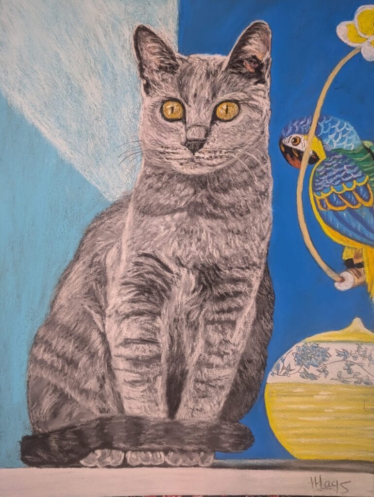 La palette de couleurs choisie par l’artiste, dans des tons de gris bleuté pour le pelage et de jaune doré pour les yeux, reflète parfaitement l’apparence classique du Chartreux. Les variations de gris ajoutent profondeur et dimension au pelage, tandis que le contraste avec les yeux vifs donne une forte présence à Vahina dans l’œuvre.