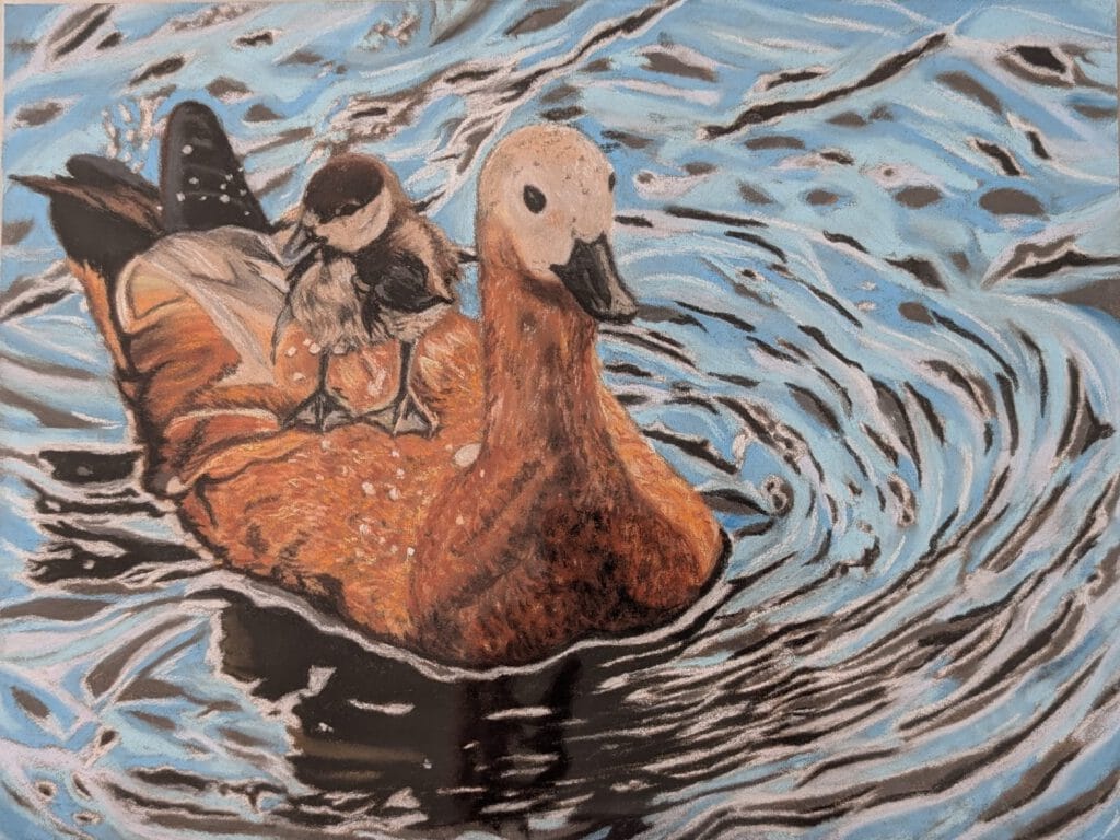 L’un des défis de cette œuvre réside dans la représentation de l’eau et de ses reflets. Magali Steiner a utilisé des techniques de pastel pour créer un effet de transparence et de mouvement, donnant l’impression que la cane et le caneton glissent doucement à la surface. Les reflets des oiseaux et la texture de l’eau sont rendus de manière réaliste, avec des lignes douces et des touches de lumière qui apportent de la profondeur à la scène. Ce travail sur l’eau contribue à donner une sensation de calme et de sérénité à l’ensemble du dessin.
