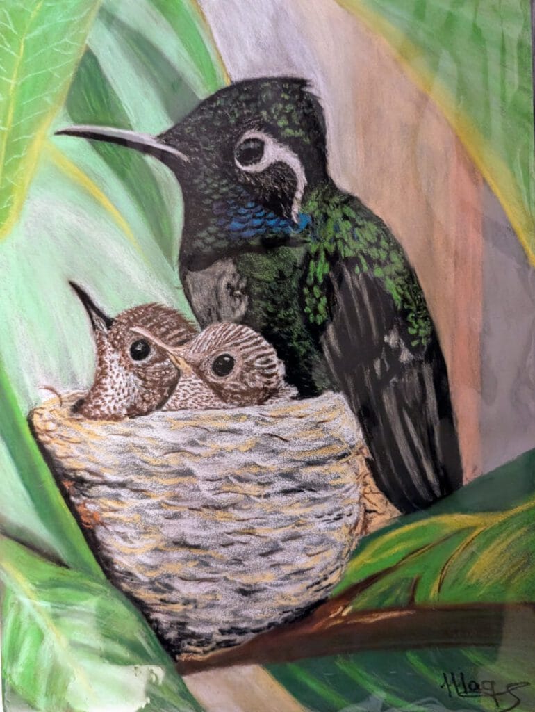 Dans l’œuvre « Colibris au nid, » Croc Pastel capture l’essence même de ces oiseaux gracieux, utilisant le pastel sec pour créer des couleurs vives et une texture douce.